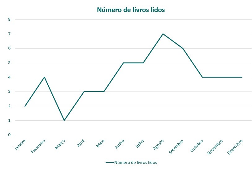 Os meses de verão consegui colocar as leituras em dia e nos últimos meses do ano houve uma certa continuidade no número de livros lidos.