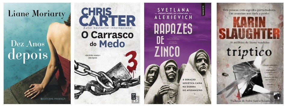 A Presença estava com boas promoções. Há aniversários próximos e decidi aproveitar para fazer compras. Como não queria pagar portes, acabei por comprar um para mim. O escolhido foi "Dez anos depois" de Liane Moriarty. Já me cruzei com boas opiniões ao livros desta escritora e por isso estou curiosa para ler. E depois aproveitei os livros a 5 euros da 20|20 editora e comprei: "O carrasco do medo" de Chris Carter, "Rapazes de zinco" de Svetlana Alexievich e "Tríptico" de Karin Slaughter.